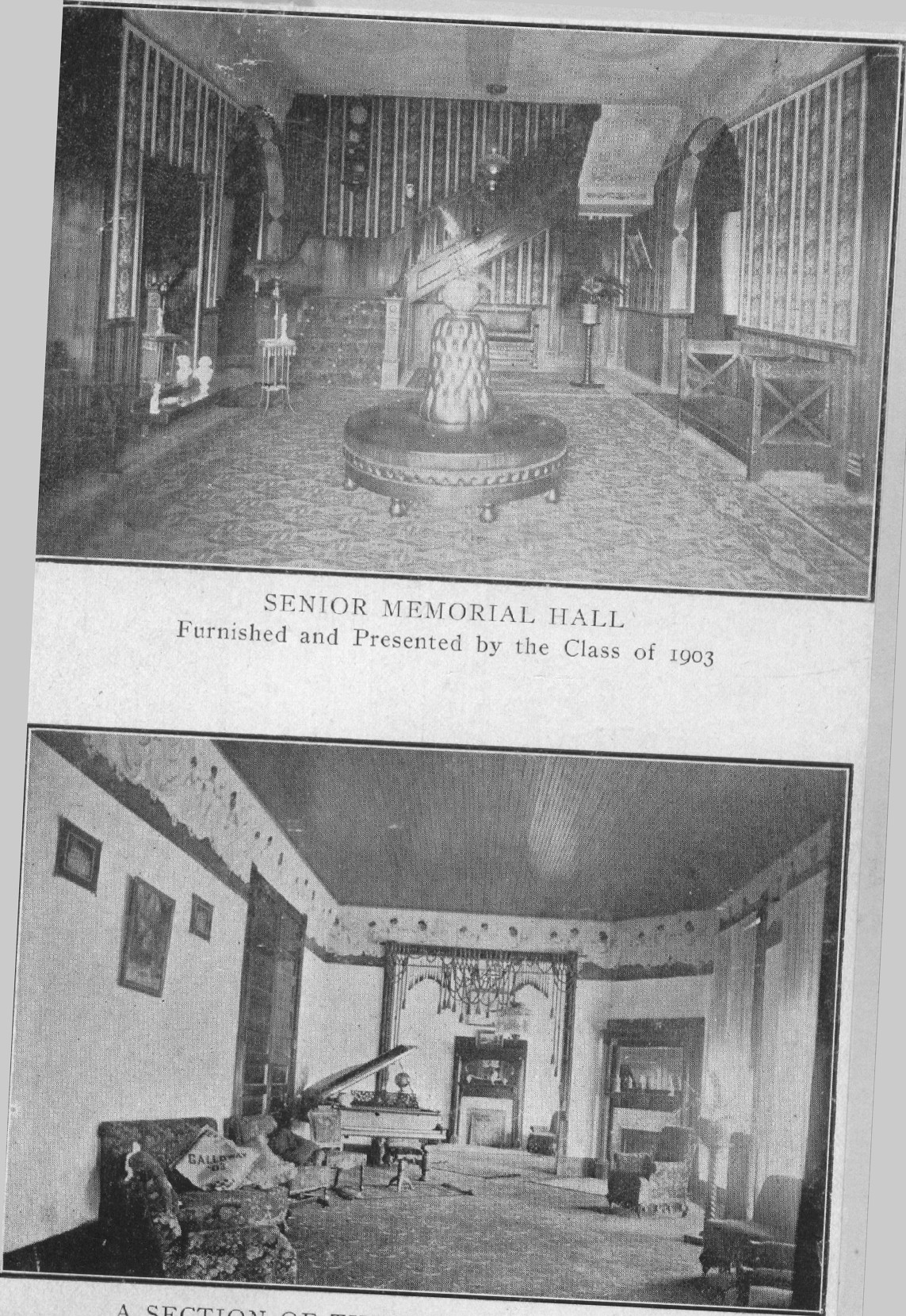 Galloway views circa 1905. Senior Memorial Hall, furnished and presented by the Class of 1903; A section of the Galloway parlors. Both views apparently taken from a Galloway yearbook. Courtesy Ivan Quattlebaum from his personal scrapbook in 1998, by White County Historical Society.
