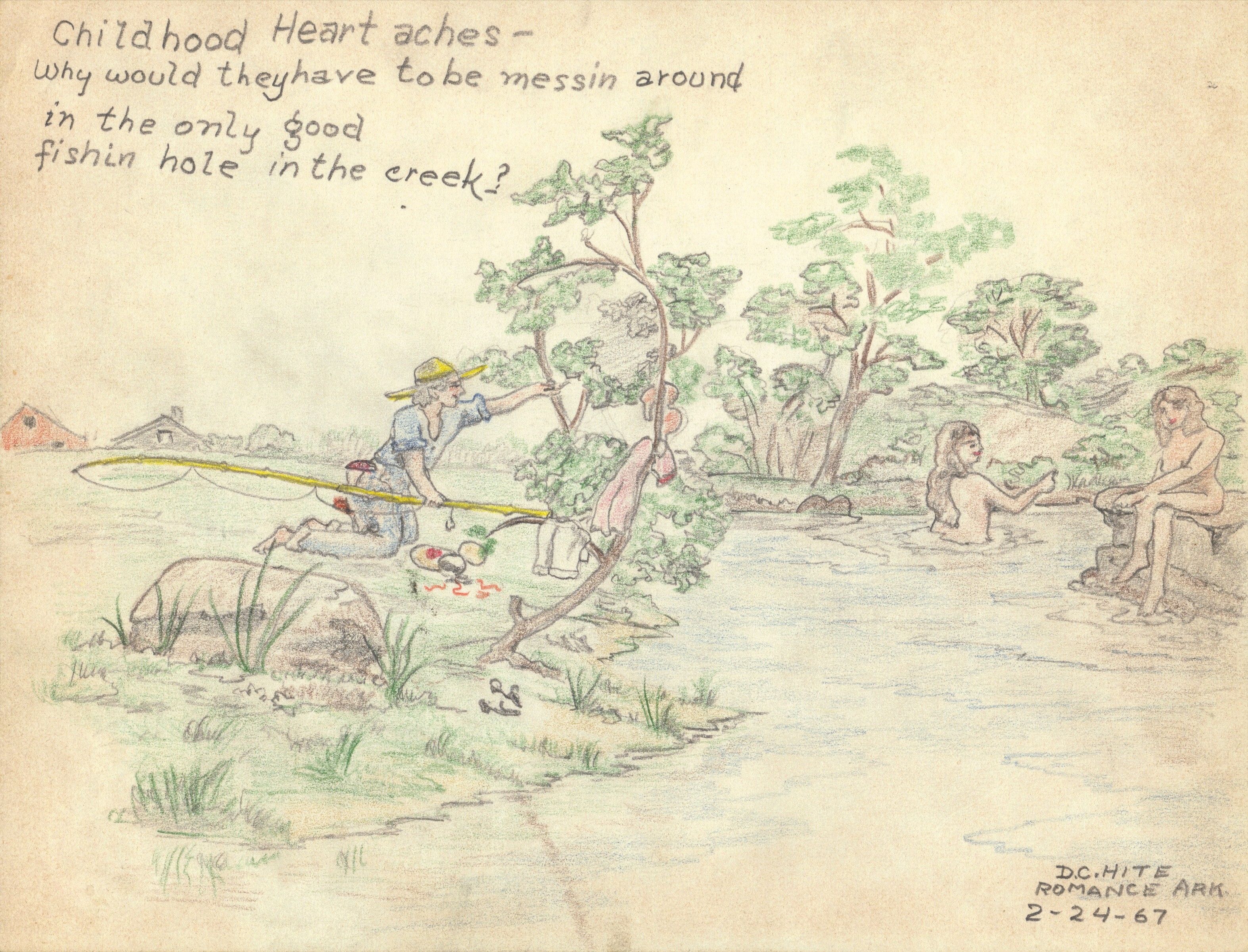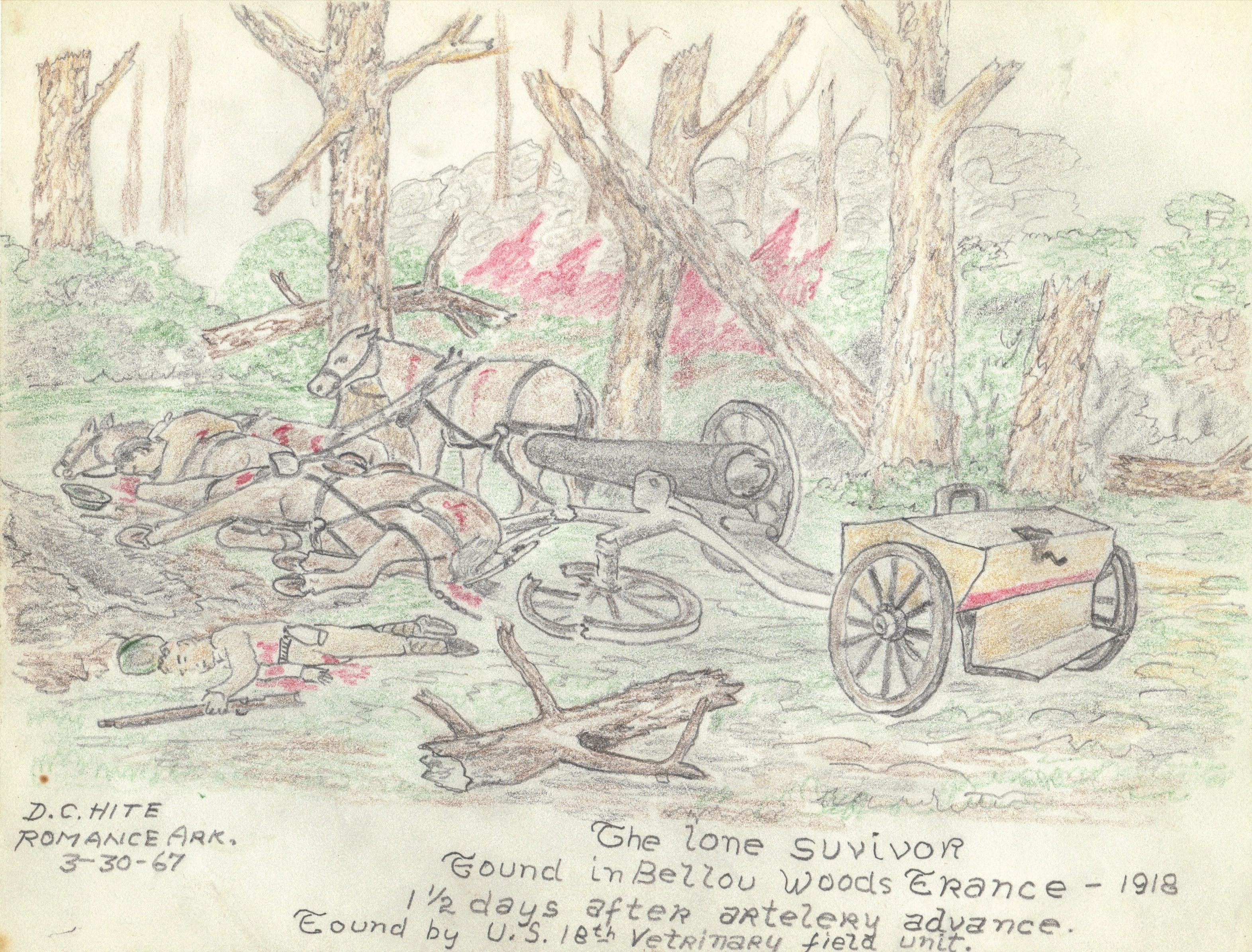 David Christopher “DC” Hite was an artist in overalls. He and his wife Bertha lived on a farm in Romance, where his hands guided the plow as well as the paintbrush. He was a self-taught artist with no formal training, but his work so delighted family members that many illustrations and paintings have survived, 40 years after his death. Born on Christmas Day in 1896, he joined the U.S. Army when World War I broke out and was assigned as a private first class to a veterinary hospital.