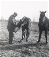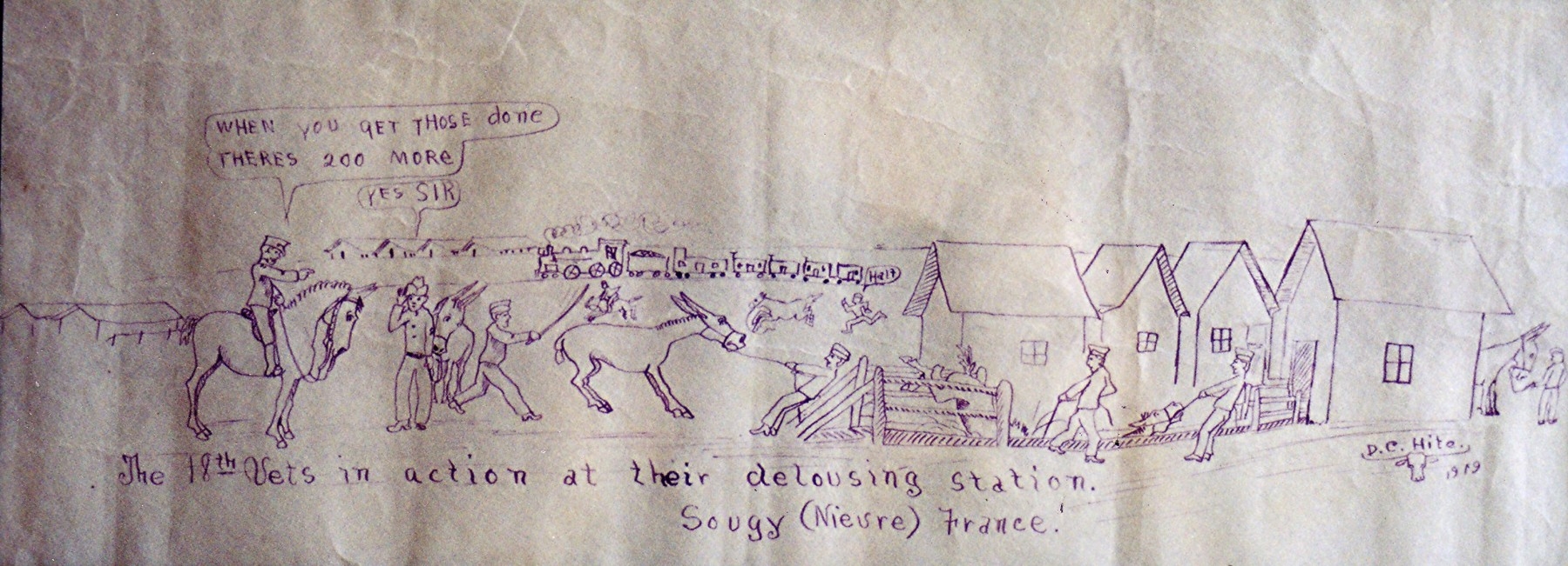 Judging from his wartime scenes, he apparently saw some bloody action and remembered it long after the war was over. His ability to handle animals helped him earn subsistence when the war ended and he settled on the farm in Romance. He enjoyed illustrating even on the battlefront. He didn’t own a camera, but brought back images of the war in his duffel bag and in his mind, which survive still today in the form of colorful sketches, some of them possibly of historical interest. We can show them only in black and white here, but most of his illustrations are in vivid color. An exception is the “delousing” sketch at the top of this page, done as a cartoon in black and white reminiscent of Bill Mauldin’s “Willie and Joe” sketches that were extremely popular in WWII. He