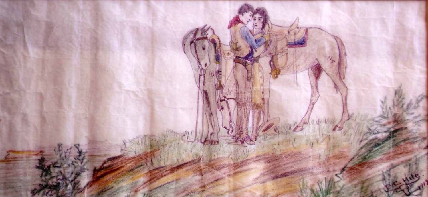 through a dipping vat, obviously to eradicate the European insects that they carried. During WWI, mules were still the primary way to move heavy field artillery. Another significant wartime image sketched by the White County farmer was a bloody scene in Bellow Woods, France, where Pfc. Hite’s unit found only a solitary mule standing among dead corpses after an intense battle. He drew the picture nearly 50 years later, on March 30, 1967, about five months before he died at age 71. Combat wasn’t the only thing on the young soldier’s mind while he was serving in France. Found in his collection was a colorful sketch of a cowboy and his cowgirl, dated 1919. Bertha died in 1988 at age 82. The collection of Hite art went to their son Robert Hite, a Korean War veteran, and when he died in 1995, the art
