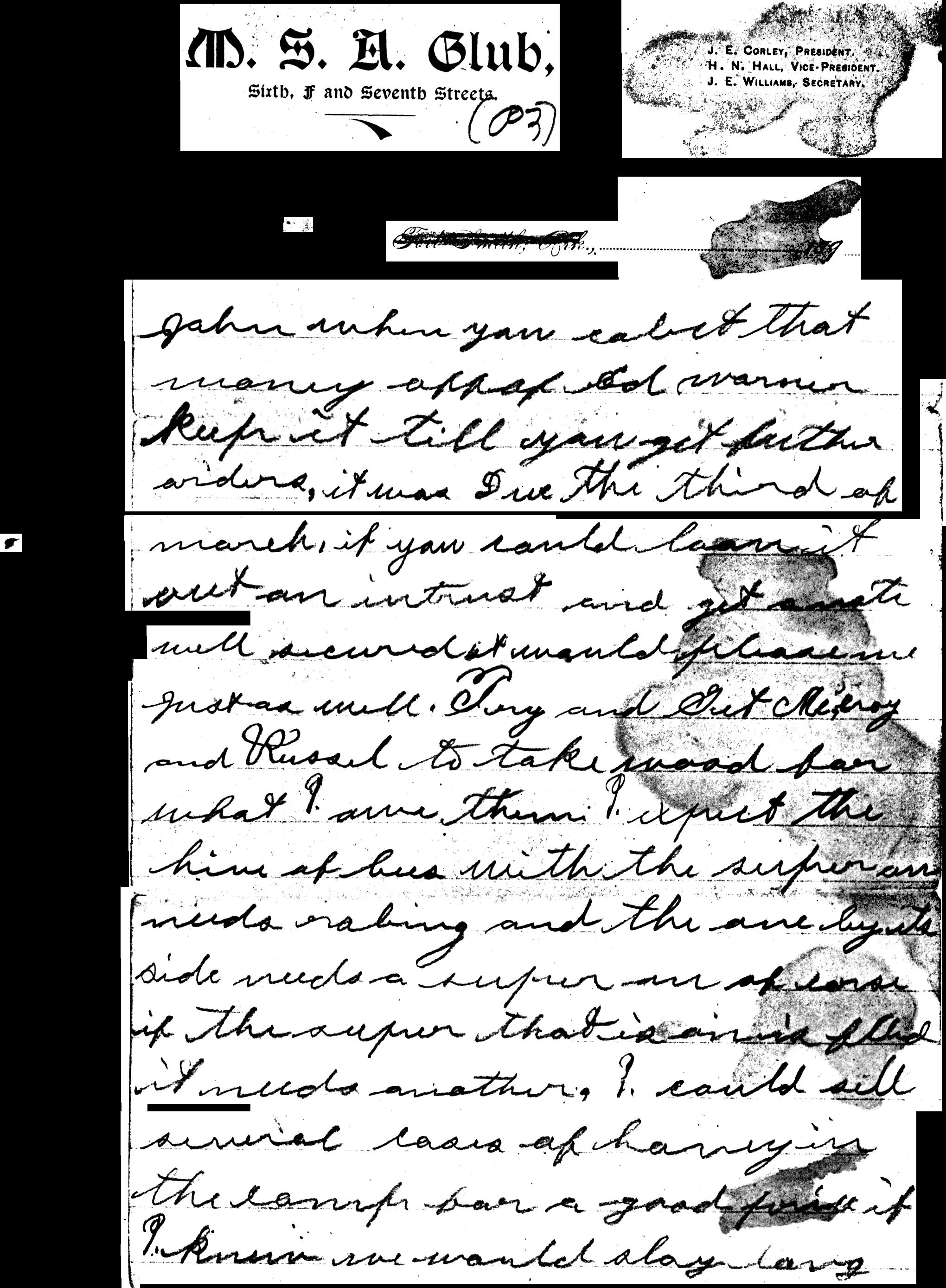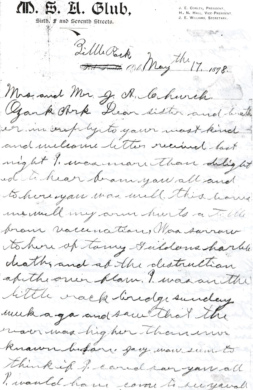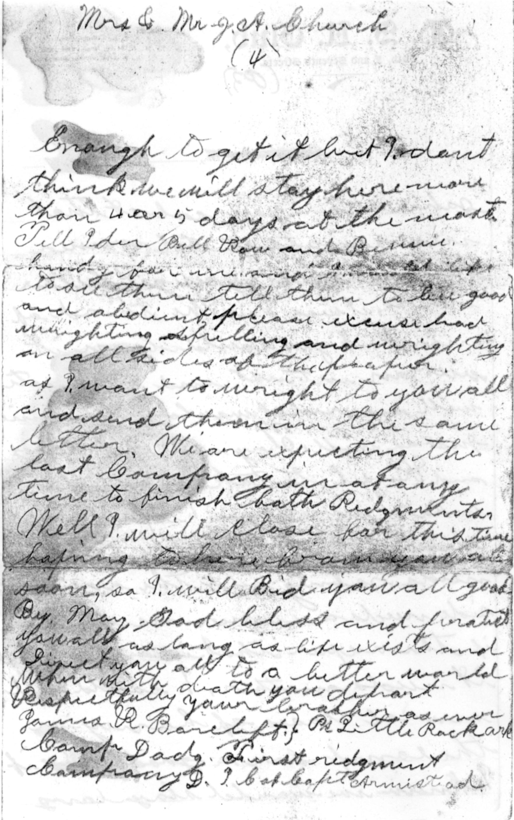 Dear Sister and brother in reply to your most kind and welcome letter received last night. I was more than delighted to hear from you all and to here you was well. this leaves me well my arm hurts a little from vaccinations. Was sorrow to hear of tomy Guildons horible death, and of the destruction of the over flow. I was on the little rock bridge sunday week ago and saw that the river was higher than ever known before. Jocy now seem to think if I cared for you all I would have came to see you all, but I thought if you all cared anything for me you would protest against me going and I had desided to go without sheding tears so I thought the best way to do that was to go without informing any one of my going away. My intention was when I left home was to go out on the Arkansaw Central and apply for a job if failed to enlist. I was mustered in last saturday. We are drawing government rashions now which is better then the stale furnished us. The ladies gave us a grand reception the day we left ther, they have presented us a fine silk flag, cash $49 dollars since we have been here. Well John I will try and sind my kees in this letter if I dont forget them like I did before. John when you collect that money off of Ed Warner keep it till you get further orders, it was due the third of March, if you could loan it out on interest and get a note well secured it would please me just as well. Try and get McCray and Russel to take wood for what I owe them. I expect the hive of bees with the super on needs robing and the one by its side needs a super an of course if the super that is on is filled it needs another. I could sell several cases of honey in the camp for a good price if I knew we would stay long enough to get it, but I dont think we will stay here more than 4 or 5 days at the most. Tell Ider Belle, Roy and Bennie howdy for me and that I would like to see them. Tell them to be good and obedient please excuse bad wrighting, spelling and wrighting on all sides of this paper. as I want to wright to you all and send them in the same letter. We are expecting the last company in at any time to finish both regiments. Well I will close for this time hoping to here from you all soon, so I will bid you all good by. May God bless and protect you all as long as life exists and direct you all to a better world when with death you depart. Respectfully your brother as ever, James R. Barclift, At Little Rock Ark