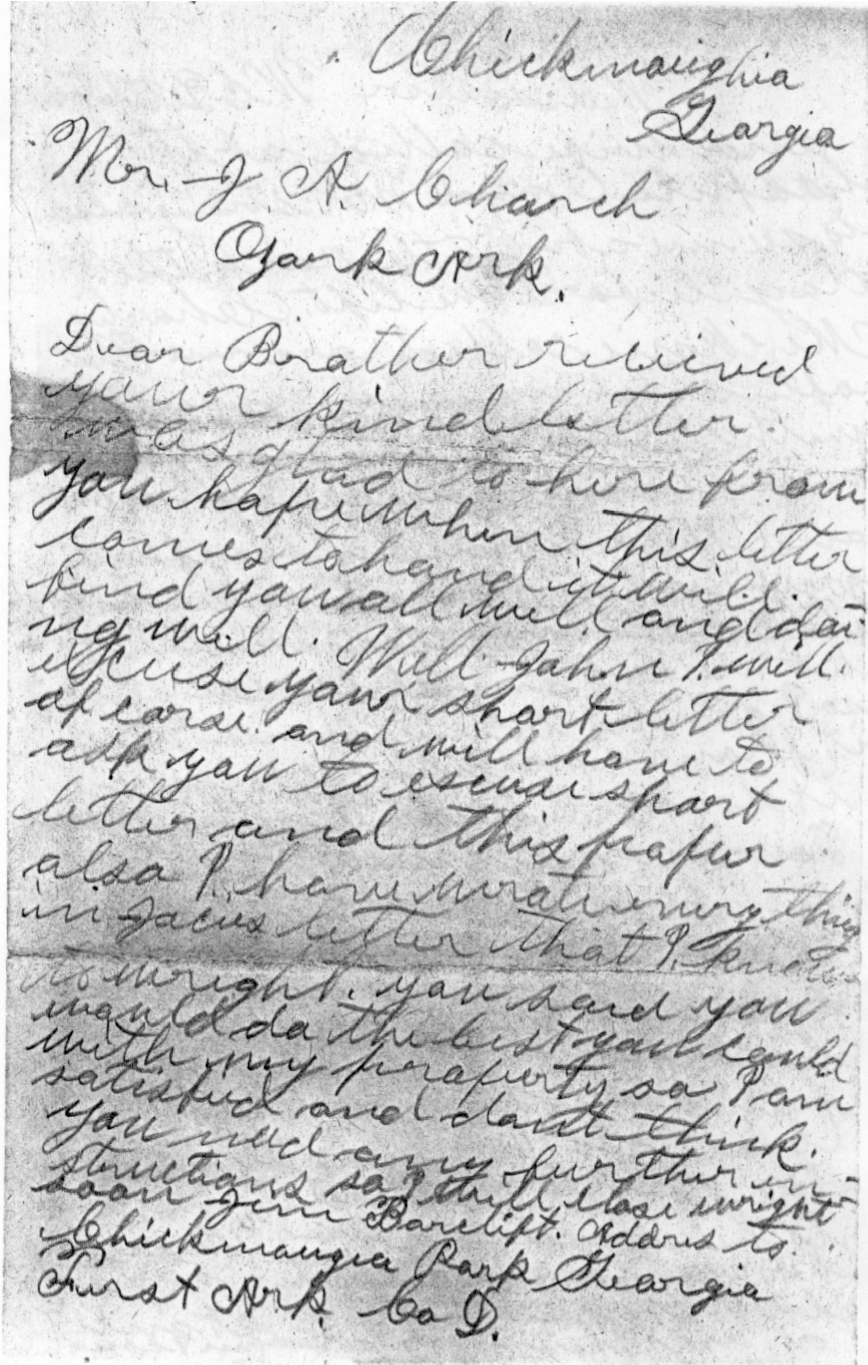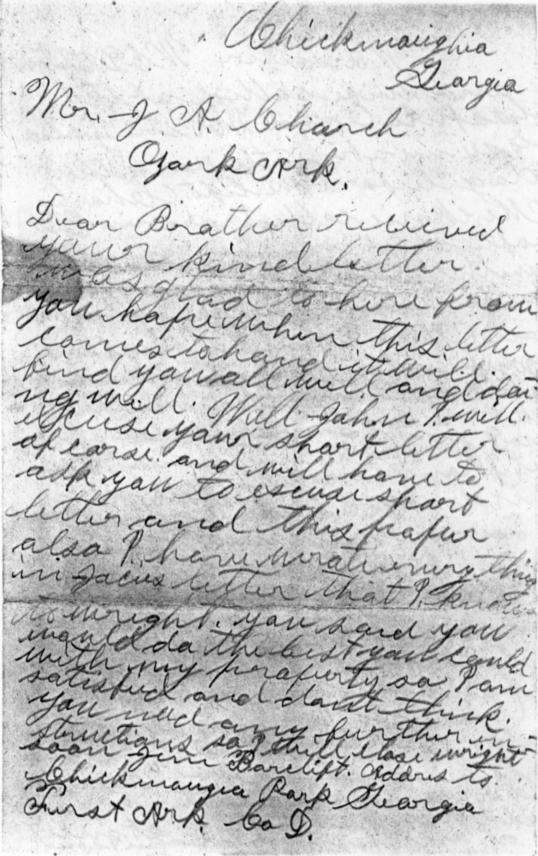 Dear Brother received you kind letter was glad to here from you. Hope when this letter comes to hand it will find you all well and doing well. Well John I will excuse your short letter of corse and will have to ask you to excuse short letter and this paper also. I have wrote everything in Jocies letter that I know to wright. You said you would do the best you could with my property so I am satisfied and dont think you need any further instructions. So I will close wright soon. Jim Barclift. Addres to Chickamauga Park Georgia First Ark. Co D.