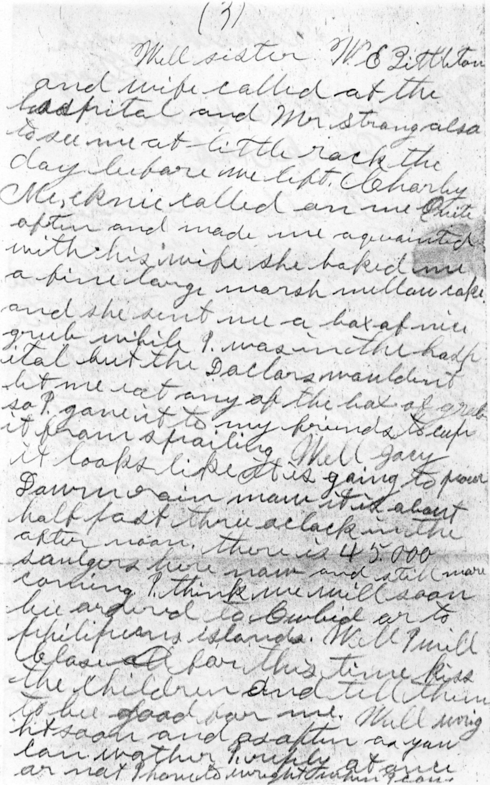 Dear Sister and brother it is with the greatest of pleasure that I wright you a few lines in reply to your most kind and welcome letter which I received some time ago. Was glad to hear from you all and glad to hear that you all was well. This leaves me much better than I have been but I was sick all the way out here from Little Rock. Just got out of the hospital Wed morning and started for Chickamauga at six o'clock that night got in Memphis for breakfast. Got dinner at Corinth, Miss. Have forgot the place where we got breakfast and on friday, but we taken dinner at Chattanoogia, Tenn and supper in Chickamaugua Park where we are now. This is a fine piece of woods pine and oak is the principle groth. Of corse there is large open fields in the park no fence. There is large monuments scattered all over the hole thing and lots of cannons standing right where they were planted and used in the rebelion. The old timber shows that it has bin shot all to pieces in time. Lead is easy to find. Well sister if you can find any one that can want those shots give them to who ever it may be. The cow can easily make her living out side till cold weather. She will give milk about the 3rd of February. Has my sow got any pigs yet. She runs about the Depot. I got a letter from papa just before I left Little Rock. He said he was well and that was about all he did say. William was at Dartnell when he wrote his part and mailed the letter. Well sister W.E. Littleton and wife called at the hospital and Mr Strang also to see me at little rock the day before we left. Charly MecKinie called on me quite often and made me aquainted with his wife she baked me a fine large marsh mellow cake and sent me a box of nice grub while I was in the hospital but the Doctors wouldnt let me eat any of the box of grub so I gave it to my friends keep it from spoiling. Well Jocy it looks like it is going to pour down rain now it is about half past three o'clock in the after noon. There is 45,000 soulgers here now and still more coming. I think we will soon be ordered to Cubia or to philipeans Islands. well I will close for this time. Kiss the chldren and tell them to bee good for me. Well write soon and as often as you can wather I reply at once or not. I have to wright when I can.
