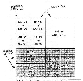 Within each section, the land is referred to as half (230 acres) and quarter (160 acres) sections. A one-sixteenth division is called a quarter (40 acres of a quarter. |