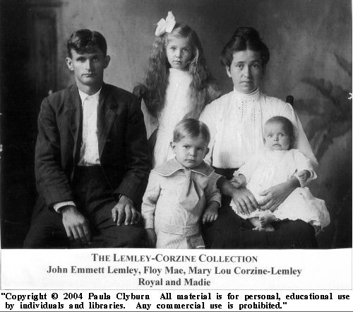 - Jones, W W Family; l to r: WW Jones, his wife Maud Ann Mouser, daughter Inez Jones McCoy, granddaughter Imogene Tibbet McCauley, daughter Mildred Essie Jones Tibbet, son Morelle Willard Jones from Elaine Martin