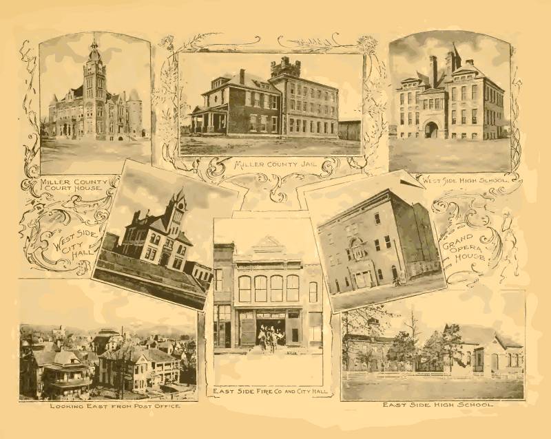 - Various Buildings - Miller Co. Courthouse, Miller Co. Jail, West Side High School, West Side City Hall, Grand Opera House, Post Office Looking East, East Side Fire Co. & City Hall, East Side High School from Bob Ewing