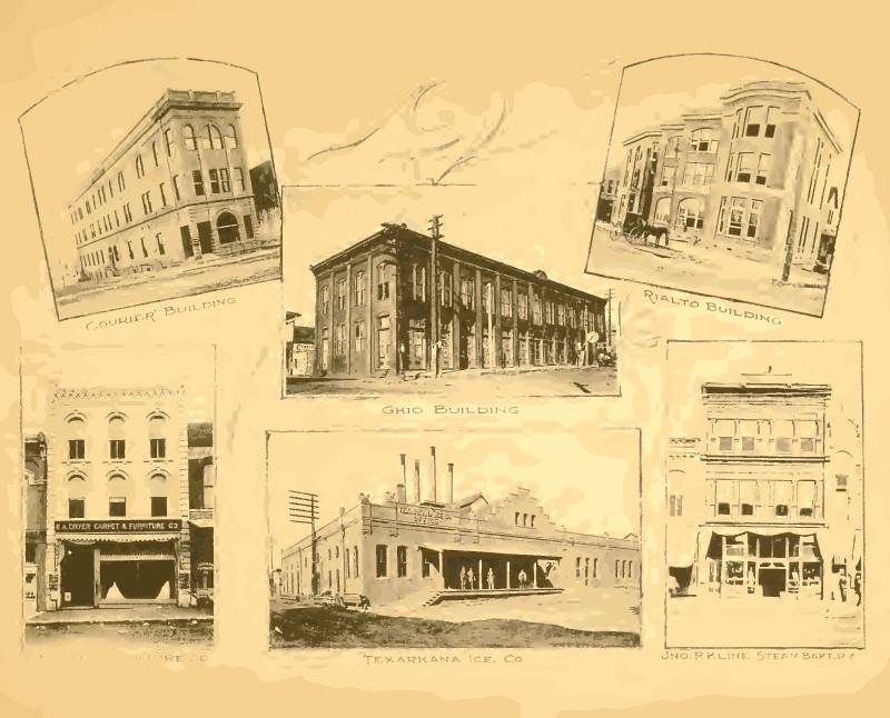 - Various Buildings - Courier Building, Ghio Building, Rialto Building, ? A ? Carpet & Furniture Co, Texarkana Ice Co., Jno R K Line Steam Bakery from Bob Ewing