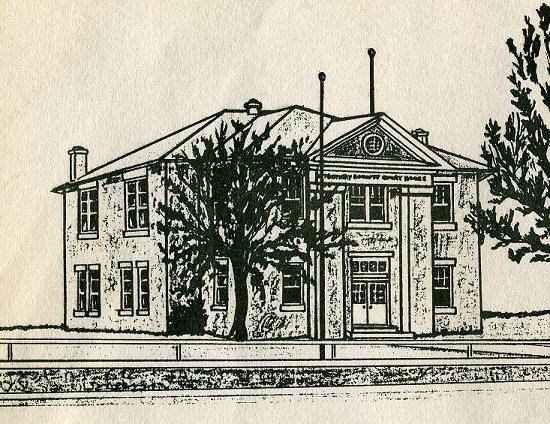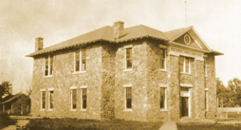 The first courthouse, a log structure, was built on the square and remained there until 1873 when it was moved to another location and used as a school and church. A new courthouse, costing $5,350 was built in 1873, with Zora L. Cotton as contractor. The old courthouse and jail were sold and the funds were applied on the new structure. In 1909 a native stone building with a vault was erected as a clerk's office to house the county records, which were complete from creation of the county. The present courthouse was built of native stone in 1923 at a cost of $40,000. The jail was built from materials taken from the old county clerk's office.