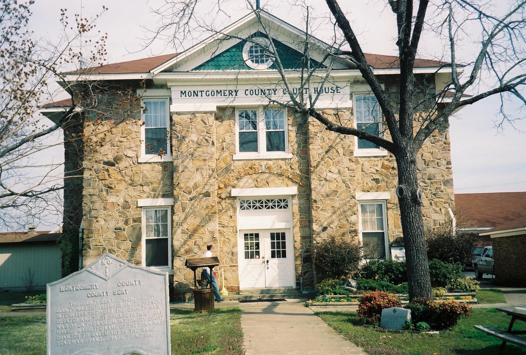 The building was remodeled in the 1970s to more than double the capacity. Up stairs is the courtroom, two judges offices and a jury room. Downstairs offices include: County Clerk, County Treasurer, Extension Service, Judge, Probation, Juvenile, Veterans Service, Assessors, Sheriff and County Tax Collector (one position) and a conference room. The vault in the County Clerk's office is 20' x 20', with only one entrance. Houses records of the clerks, sheriff, treasurer and assessor. This is were you find all the original marriage, tax, land, military discharge, books, etc, a genealogist goldmine if you have family from the county. The County Judge, (Ted Elder 1998-1999) is an elected position with a two year term and overseas road, fairground, nursing home, courthouse maintenance etc. Pervious judges include Ted Abernathy and Warneke. There is a Municipal Court and a Criminal Court Judge (in 1988 Mr. Gayle Ford). In 2007 the old Montgomery County Nursing Home is now the courthouse annex. This is the south entrance of the courthouse, now considered the back of the courthouse. Mount Ida was incorporated 18th December, 1854.